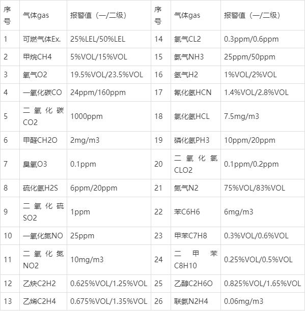 复合气体检测仪报警参数标准应当符合相应的国标规定,并且一般都是要有一、二级报警值的相关要求。根据国标《GBT 50493-2019》中对于可燃气体和有毒气体检测报警设计标准的相关规定,复合气体检测仪的报警值设定应符合以下条件:
