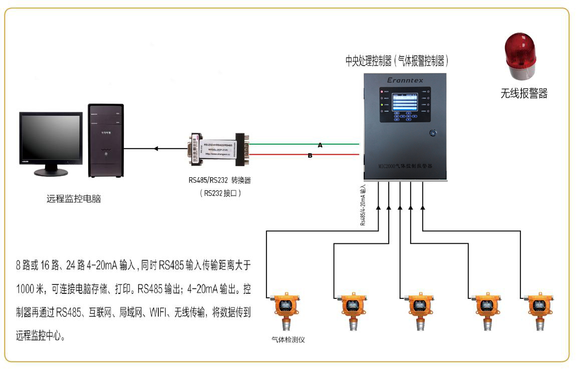 ●气体报警控制器远程传输功能,控制器可以把现场探头的实时浓度通过有线(2000米以内)